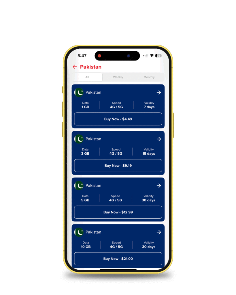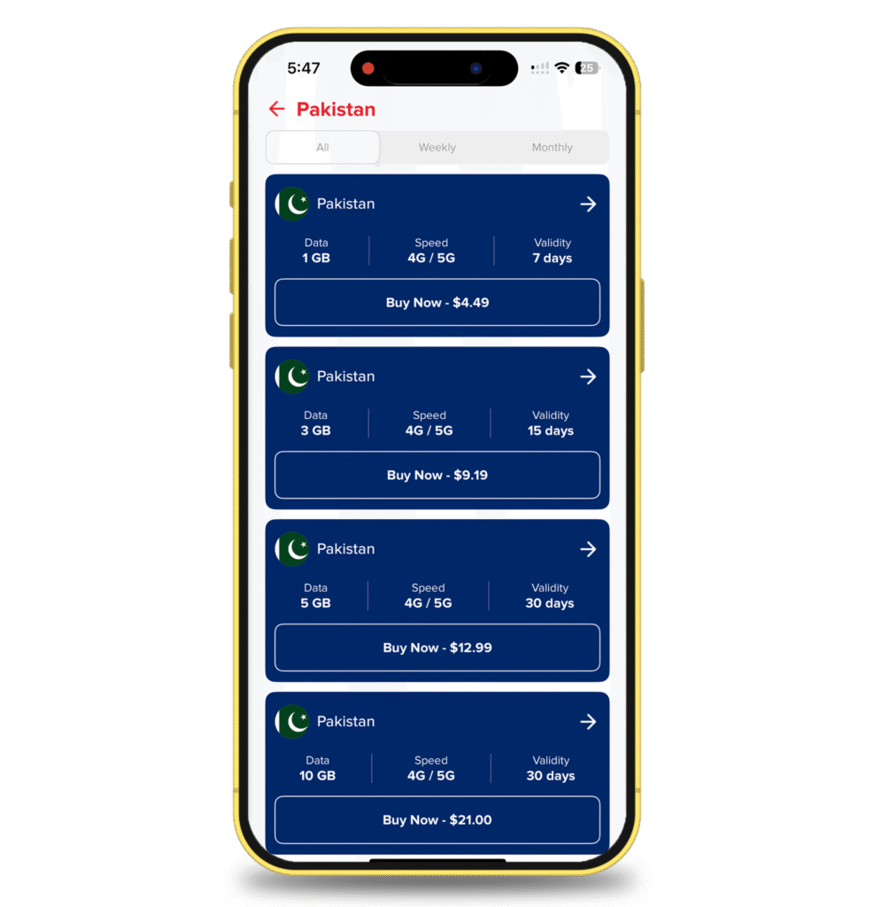 You’ll see a list of options, including weekly or monthly plans. Scroll through, compare what fits your trip best, and then hit Buy Now.