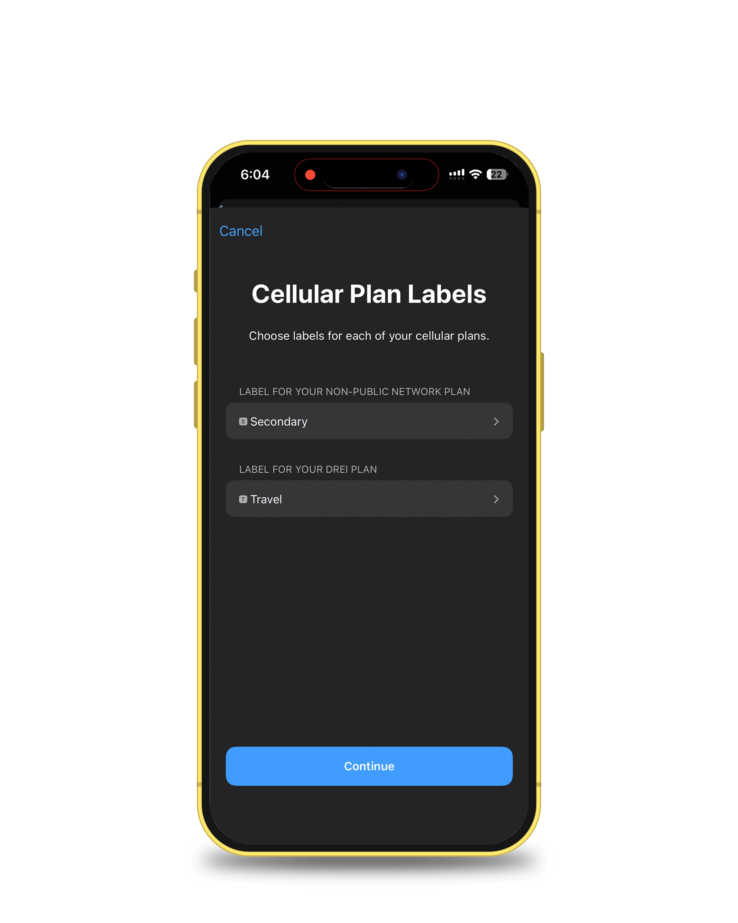iPhone will ask you to label the line. Tap Travel and rename it to something like SlickeSIM. Trust me, when you’re juggling multiple lines, you’ll want clear names. Tap Continue.