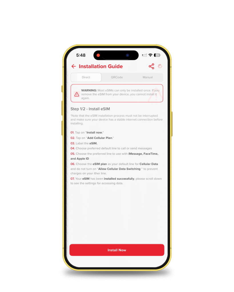 To activate an eSIM on iPhone Pro Max directly, tap Direct. Then, tap Install Now.