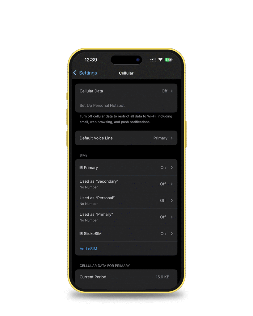 To fully activate, tap on SlickeSIM (listed under SIMs).