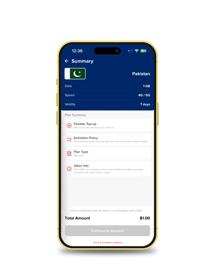 The app will remind you: not every phone plays nice with eSIM. Since you’re using an iPhone, you’re already good to go. Tick the box to confirm compatibility and tap Continue to Payment.