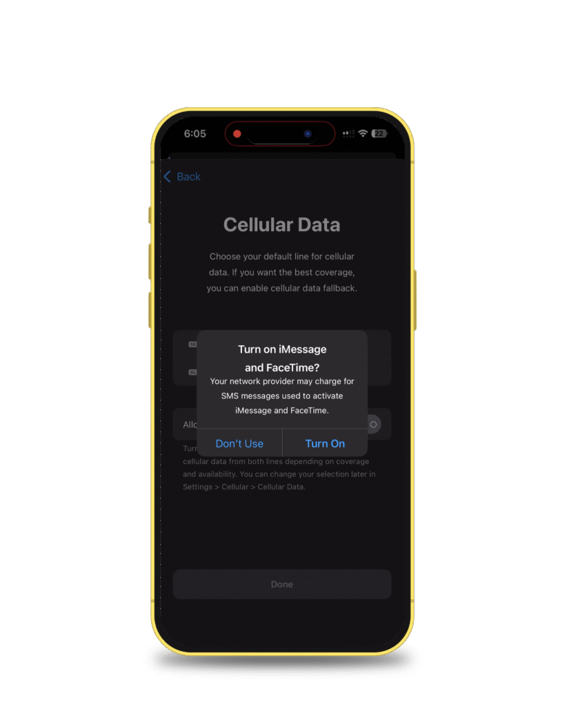 You’ll be asked which number to use for iMessage and FaceTime. Since Slick is for travel data, choose Don’t Use. Keep your main number tied to iMessage.